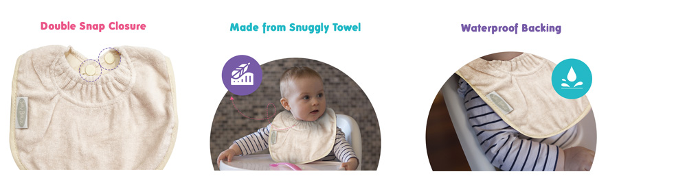 This nifty Biblet is sized just right to be your baby’s first bib! The soft and absorbent toweling fabric will keep baby’s sensitive skin dry, plus it protects those first sweet outfits. Made from Snuggly Towel with a water-resistant nylon backing, this range has the clever snuggle neck guard, which sits snug against your baby’s neck to stop dribbles and spills - perfect for bubs with eczema.